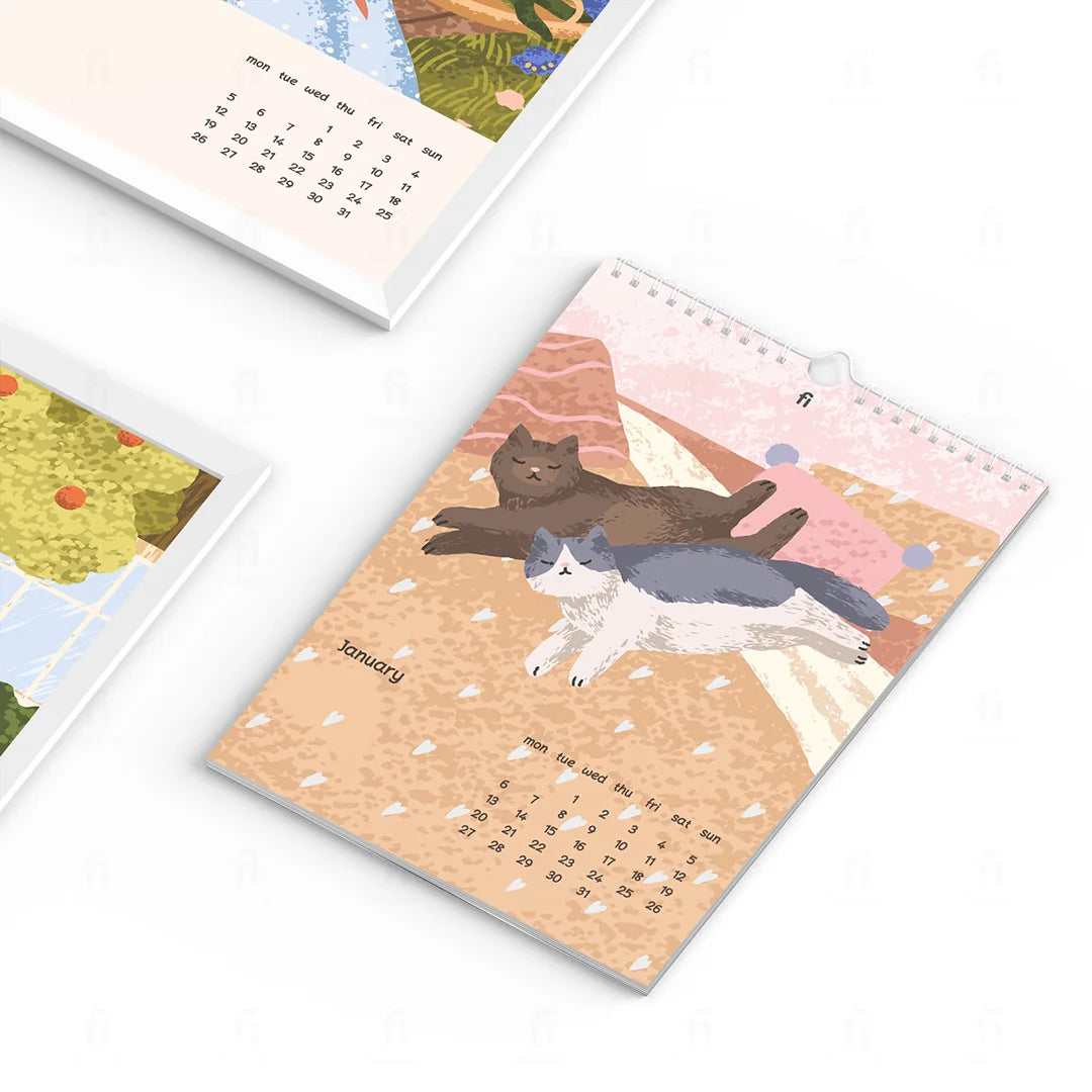Każdy miesiąc zachwyca unikalną ilustracją, utrzymaną w lekkim, przyjemnym stylu, który czerpie inspirację z codziennych, pełnych uroku momentów. Starannie wykonane, barwne grafiki dodają wnętrzom przytulności, tworząc atmosferę spokoju i ciepła.w